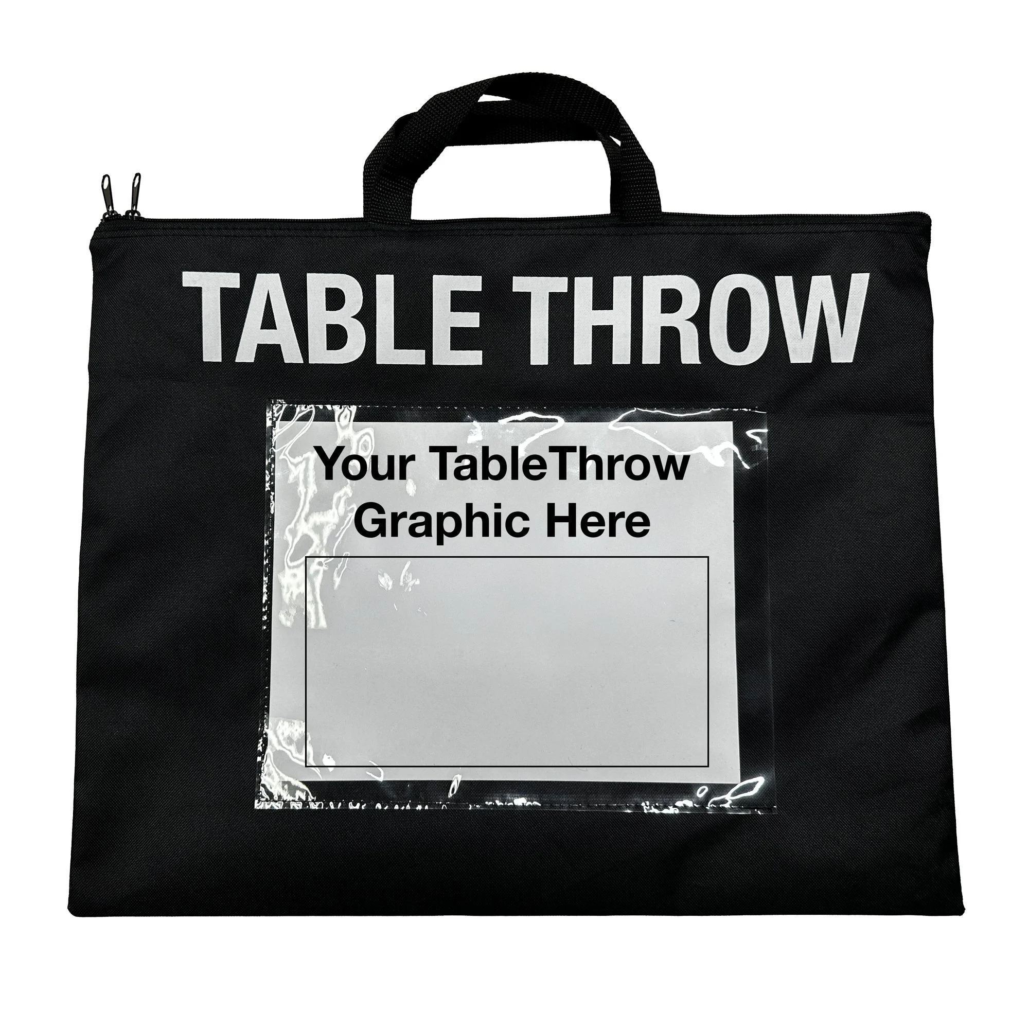 We have fitted, drape, and stretch style tablethrows, and the graphic comes in the zippered carrying bag for safe travel.